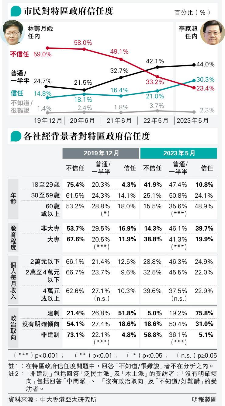 當我們比較不同社經背景人士在2019年12月和2023年5月的政治信任時,發現社會各界的政治信任均有不同程度的提升(見表)。首先,在年齡方面,年長者(60歲或以上)的政治信任一向較其他年齡層高;然而在2019年12月,信任的比例只有18%,不信任的比例有53.2%,反映當時年長人士亦不太信任政府。到2023年5月,情况明顯改善,年長者相對信任政府,信任的比例上升至48.9%,而不信任的比例下跌至15.5%。與此同時,中年人士(30至59歲)的政治信任明顯提升,信任比例由14.1%上升至24.1%,不信任比例由61.5%大幅降至25.1%。即使是政治信任一向偏低的年輕人(18至29歲)也有明顯改善,不信任比例由75.4%大幅跌至41.9%,而信任比例由4.3%微升至10.8%。
